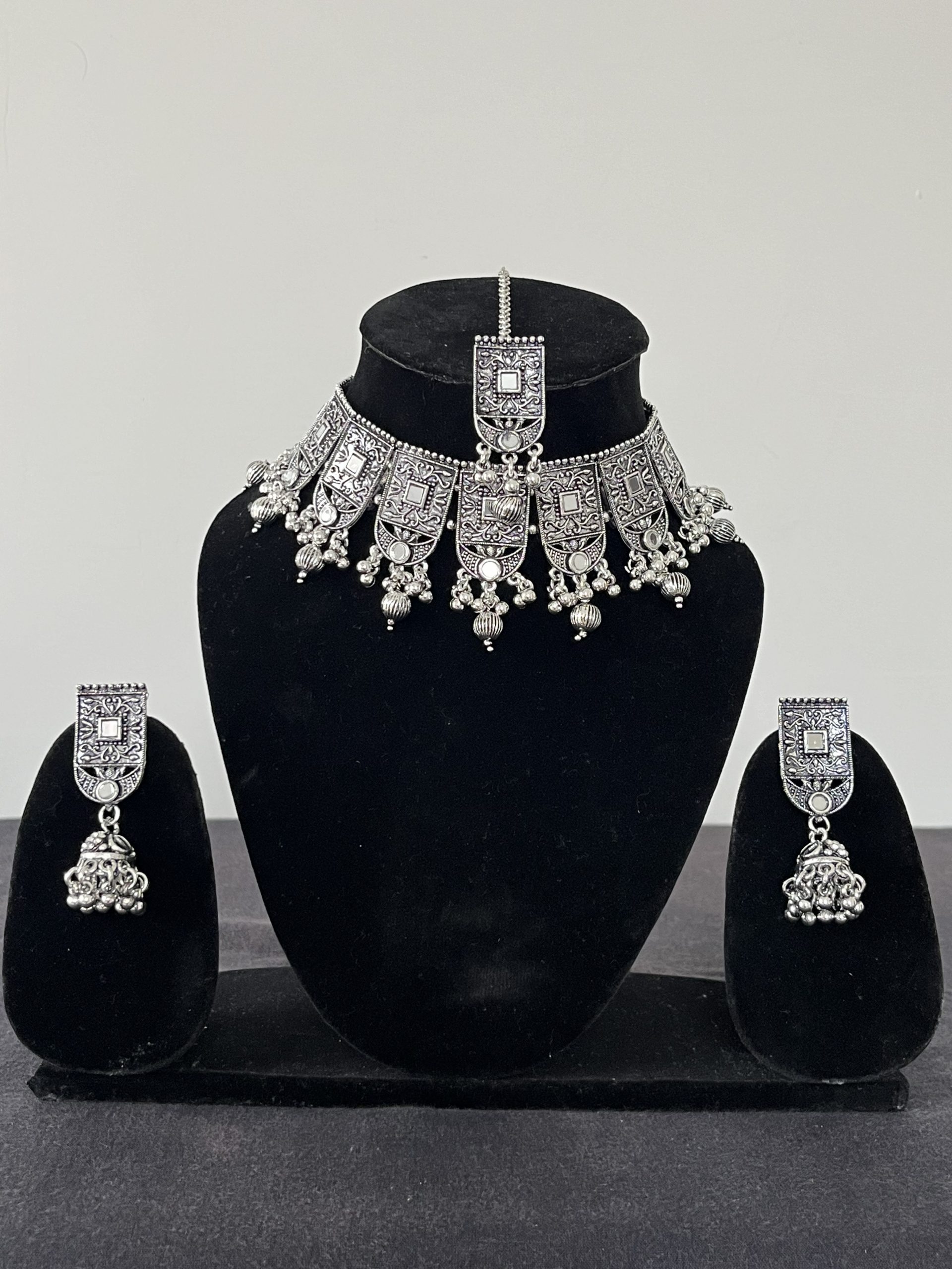 This is an elegant oxidized silver jewelry set featuring a detailed choker and matching earrings. The choker has intricately engraved rectangular panels with floral and geometric motifs, accented by dangling silver beads for a traditional touch. The matching earrings share the same design, with dome-shaped pendants and bead danglers. Ideal for pairing with ethnic outfits, this set is perfect for weddings, festivals, and cultural events, offering a bold yet timeless vintage appeal.