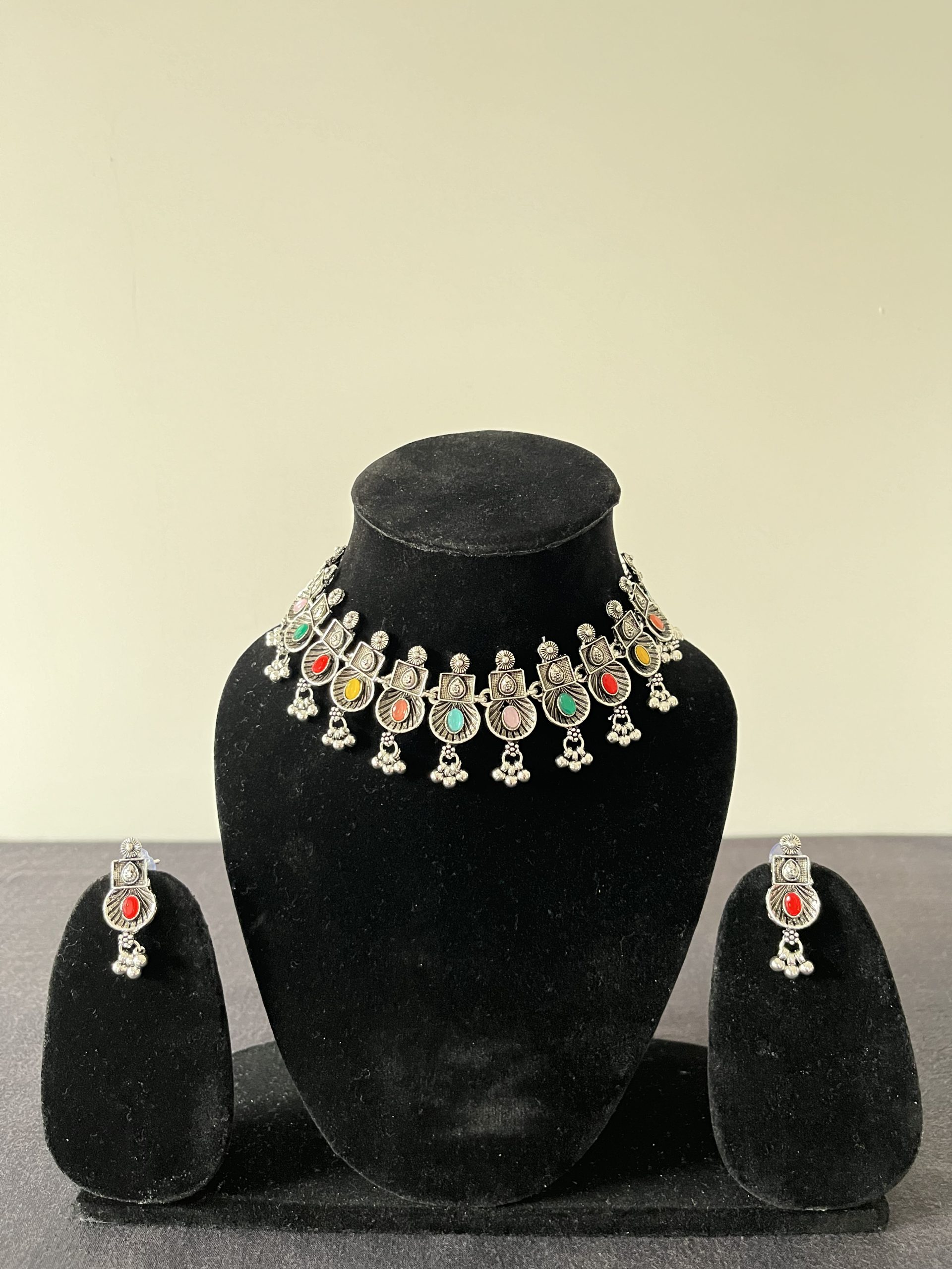 The “Vintage Bloom Set” is a stunning blend of classic elegance and bohemian charm, featuring an intricately designed choker adorned with vibrant gemstone accents. Each piece in the set showcases delicate floral motifs and rustic silver detailing, capturing the essence of timeless beauty. Perfect for both traditional and contemporary outfits, this set adds a touch of vintage allure to any ensemble.